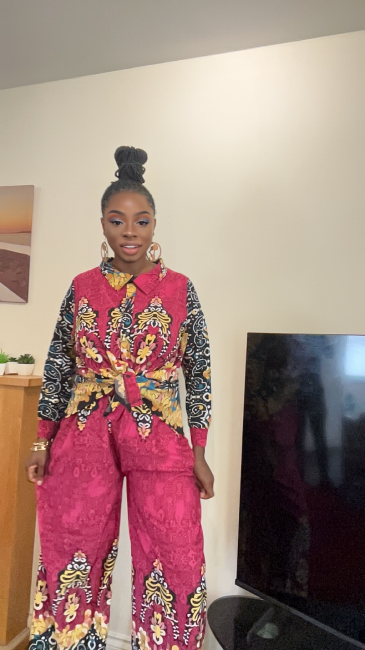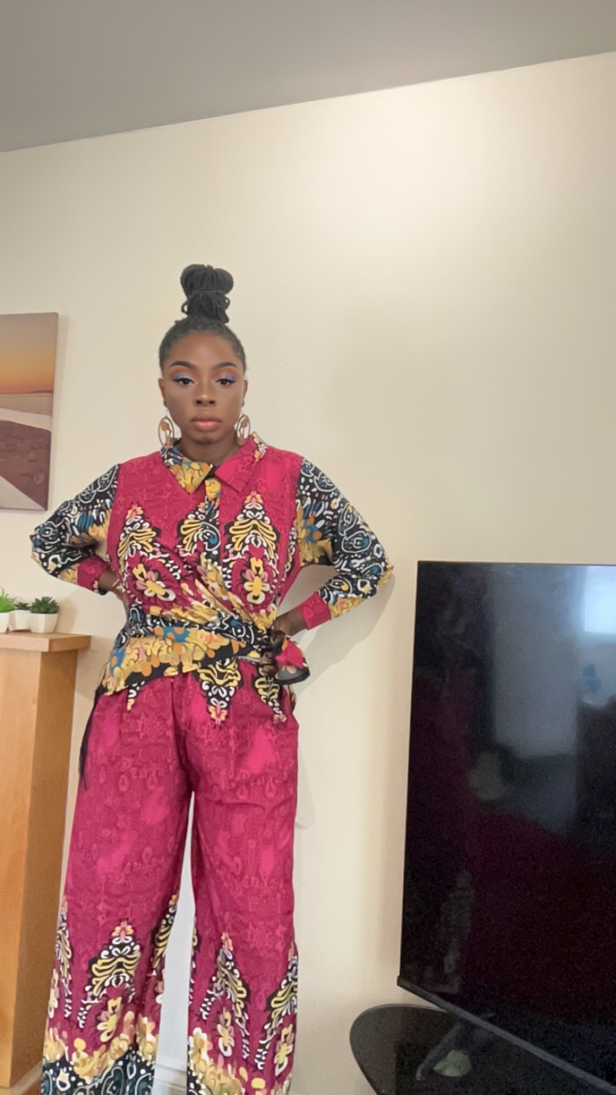 This Long Sleeve Chic Two Piece is designed for those who love to make a statement. The top features a dynamic mix of intricate designs. Dominated by rich shades of red, black, and gold, it exudes an air of luxury and cultural sophistication. The button-down front and classic collar add a touch of formality, making it versatile enough for both casual and semi-formal occasions. The long sleeves provide coverage while allowing the intricate patterns to shine, creating a harmonious balance between tradition and contemporary fashion.