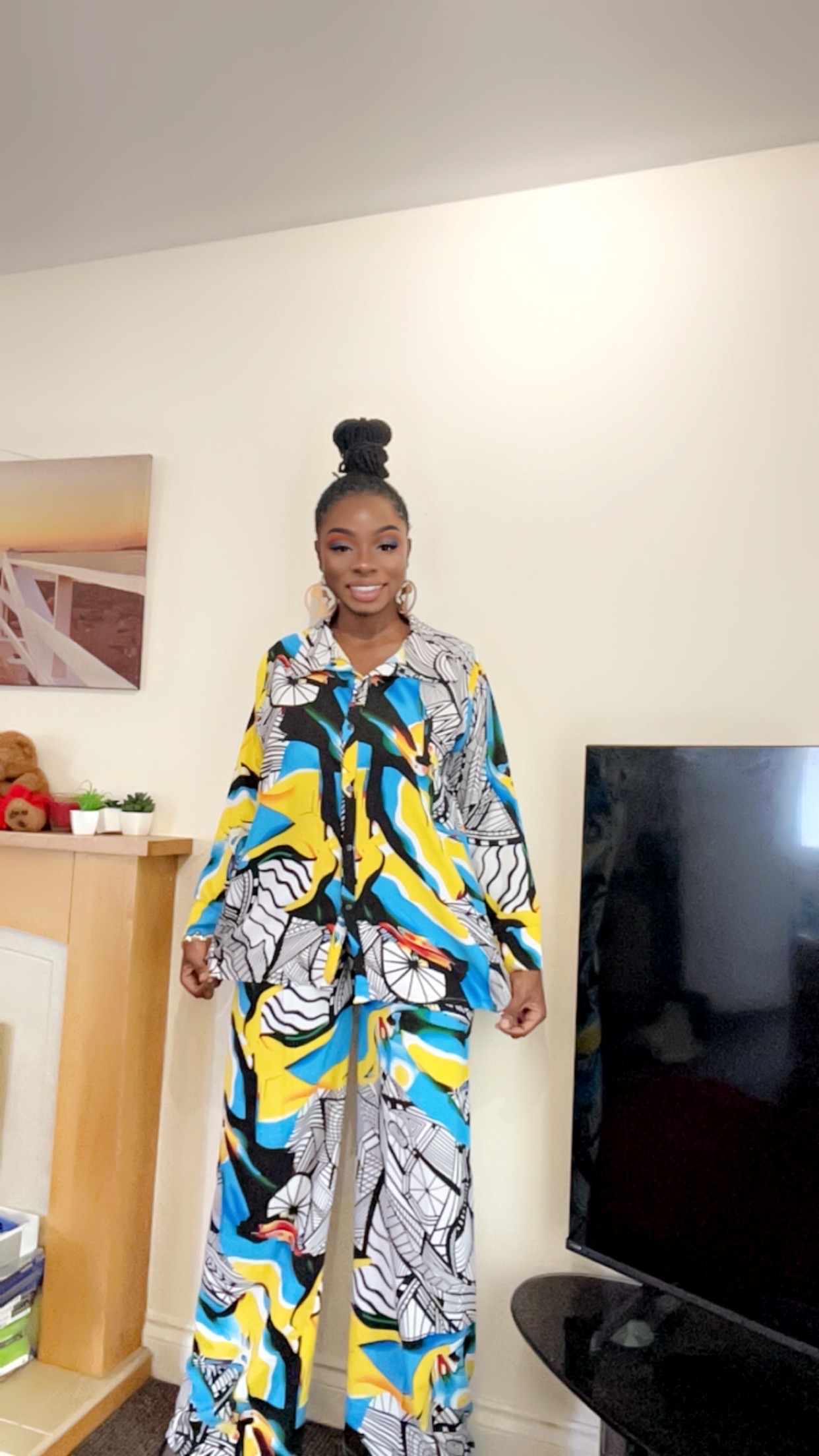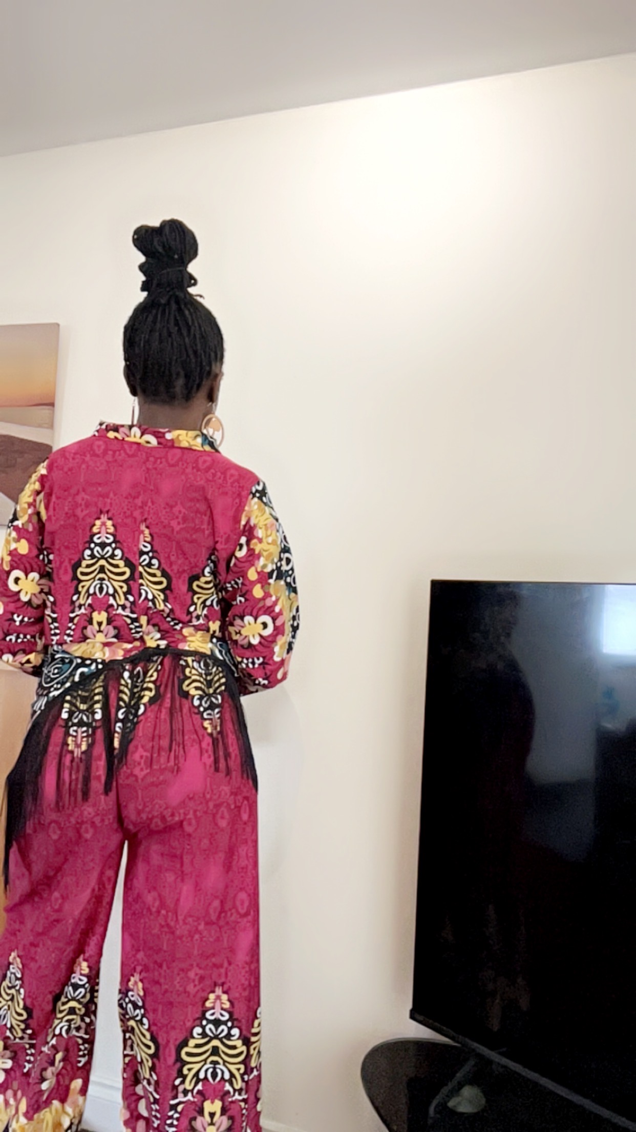 What sets the Long Sleeve Chic Two Piece apart is it’s versatility. The top and pants can be worn together for a bold, cohesive look, or mixed and matched with other pieces in your wardrobe for endless styling possibilities. Pair the top with black trousers or a sleek skirt for a different look, or wear the pants with a simple blouse to let their intricate design stand out. The options are as limitless as your imagination.