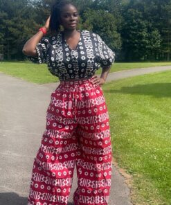 This set features a matching short-sleeve crop top and wide-leg palazzo trousers, designed in a coordinated traditional red and white tribal motif. The print is vibrant, eye-catching, and rich with African-inspired patterns that exude power, elegance, and heritage.